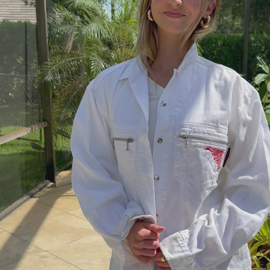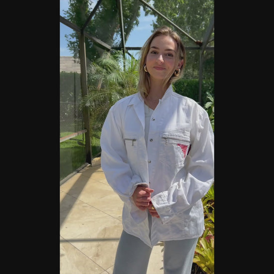 This up-cycled vintage white denim jacket is reimagined with bold Aerosmith accents for the ultimate rock ’n’ roll statement piece. Handcrafted from pre-loved denim, it combines timeless style with sustainable fashion. Featuring unique details inspired by the legendary band, this jacket is perfect for fans who want to showcase their love for music while keeping their look edgy, modern, and eco-conscious.