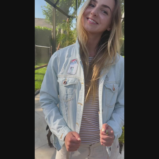 A chic up-cycled light denim jacket inspired by the charm of Parisian cafés, featuring soft, romantic details and vintage accents. Perfect for adding a touch of French elegance to your everyday style. A soft white denim up-cycled jacket. This particular one I get stopped and complemented!