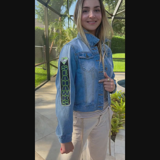 Up-cycled denim jacket featuring bold Seattle Seahawks team logos and spirited accents—perfect for showcasing your 12th Man pride with a unique, game-day-ready look. Go Seattle!